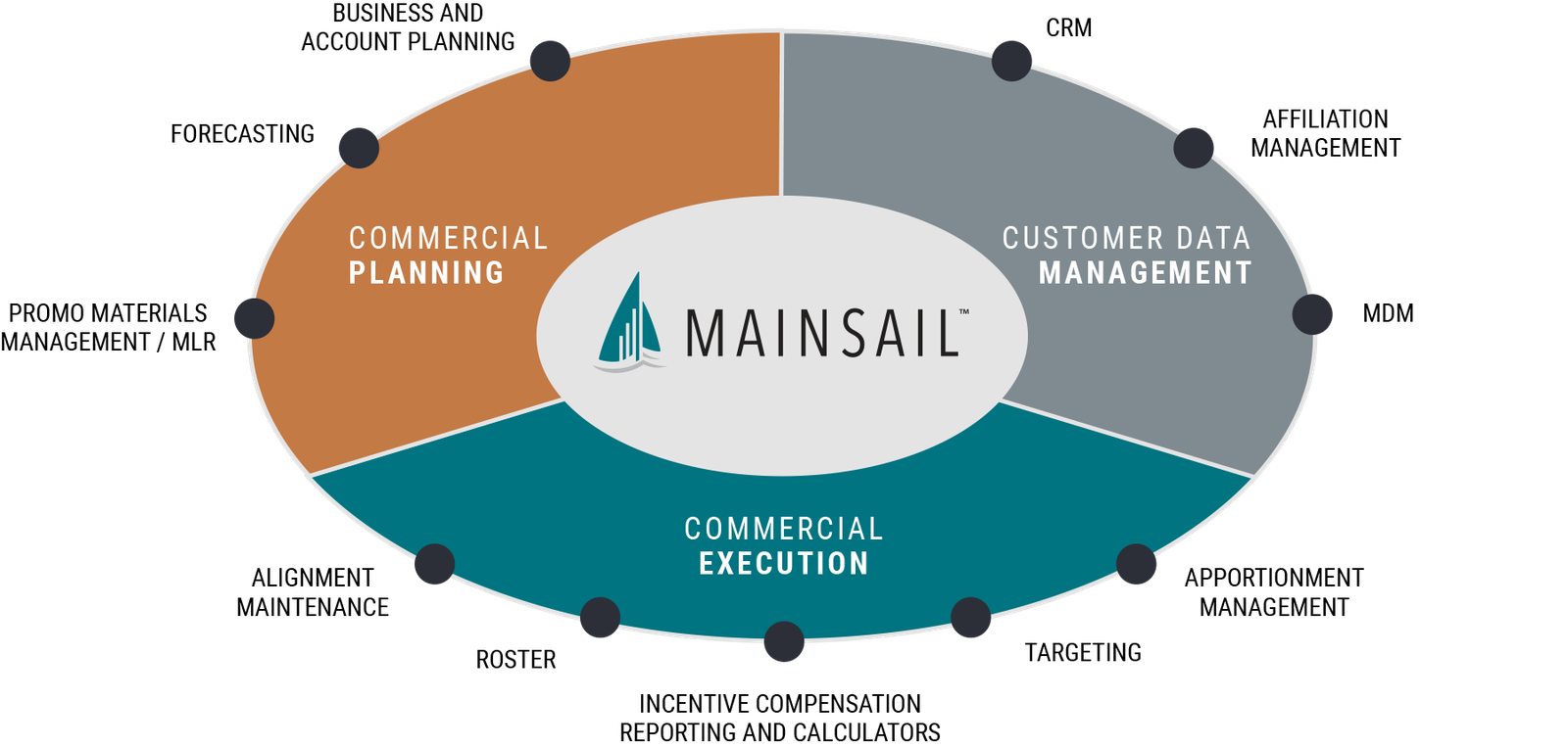 Mainsail combines the flexibility of custom development with the efficiency, ease of use and stability of off-the-shelf products. Life sciences companies can manage end-to-end commercial operations in Mainsail or use the platform for specific commercial activities like forecasting or incentive compensation.
